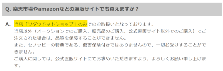 公式サイトによると、セノッピーは公式サイト「ソダツドットショップ」のみ購入可能となっています。