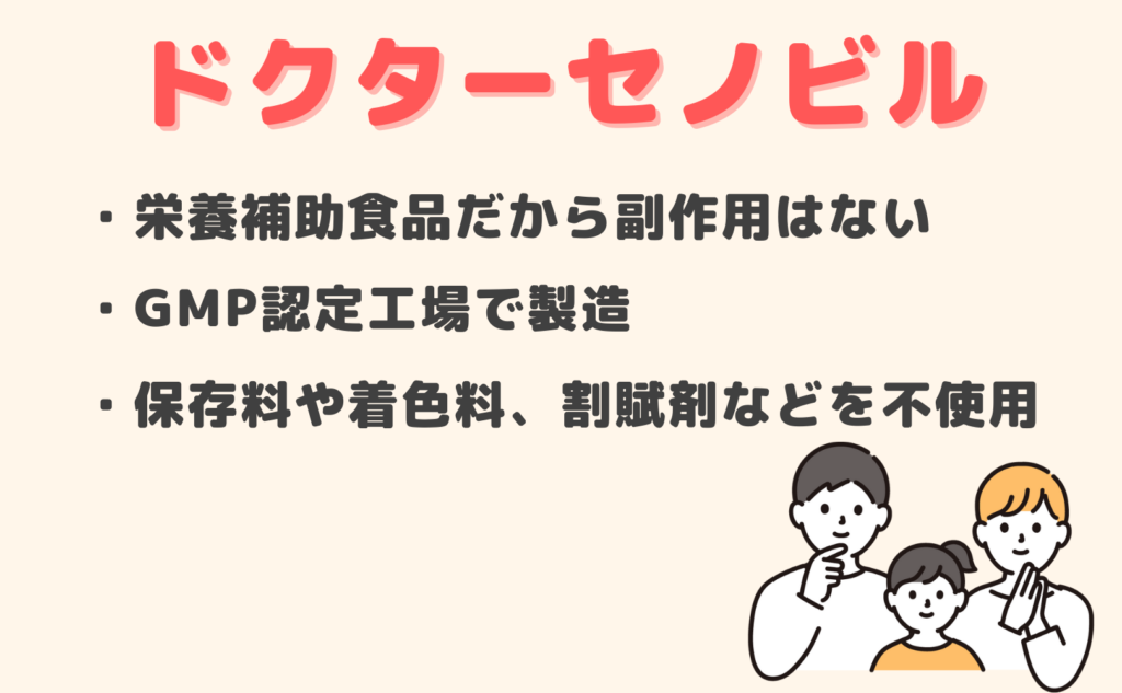 ドクターセノビルは栄養補助食品であり、医薬品ではないため、通常の使用では体に悪影響を与える成分が含まれていないとされています。